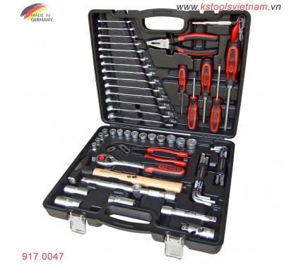 Bộ đồ nghề sửa chữa đa năng KS Tools, hệ 1/2", phù hợp cho công việc bảo dưỡng - lắp ráp cơ khí/ô tô tại xưởng và hiện trường. Gồm 47 chi tiết, chế tạo từ thép Cr-V (chrome vanadium), bề mặt mạ Chrome mờ. Made in Germany