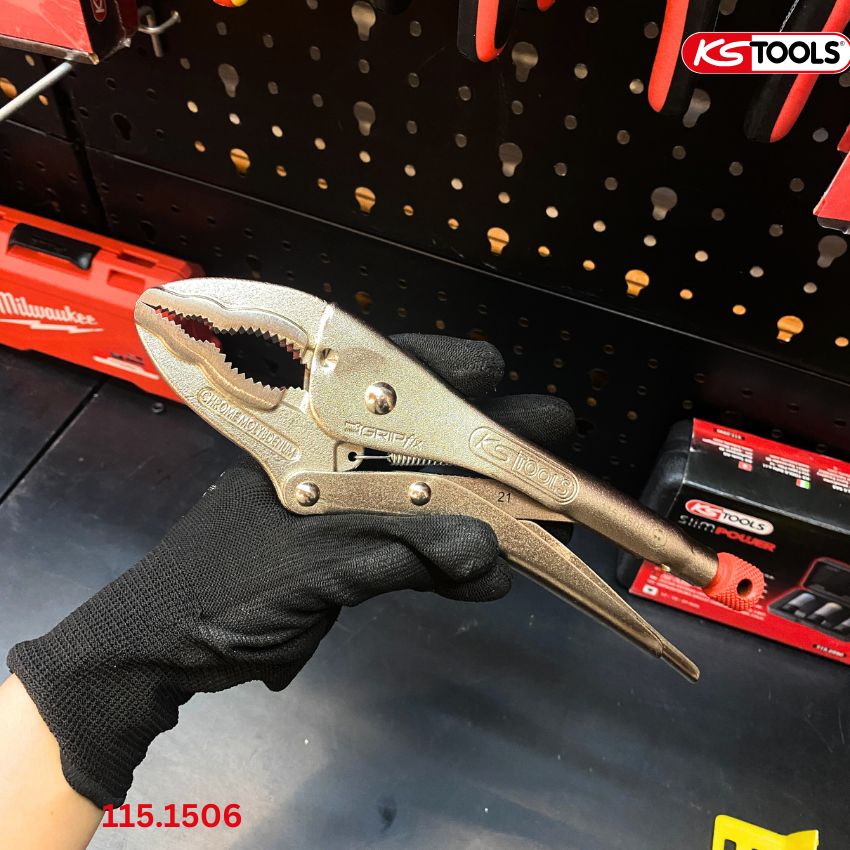 Kìm bấm chết ngàm rộng 115.1506 KS Tools Germany làm từ chrome molyden, mạ niken bề mặt, độ mở ngàm tối đa 64 mm. Lưỡi kìm răng cưa bám phôi chắc chắn.